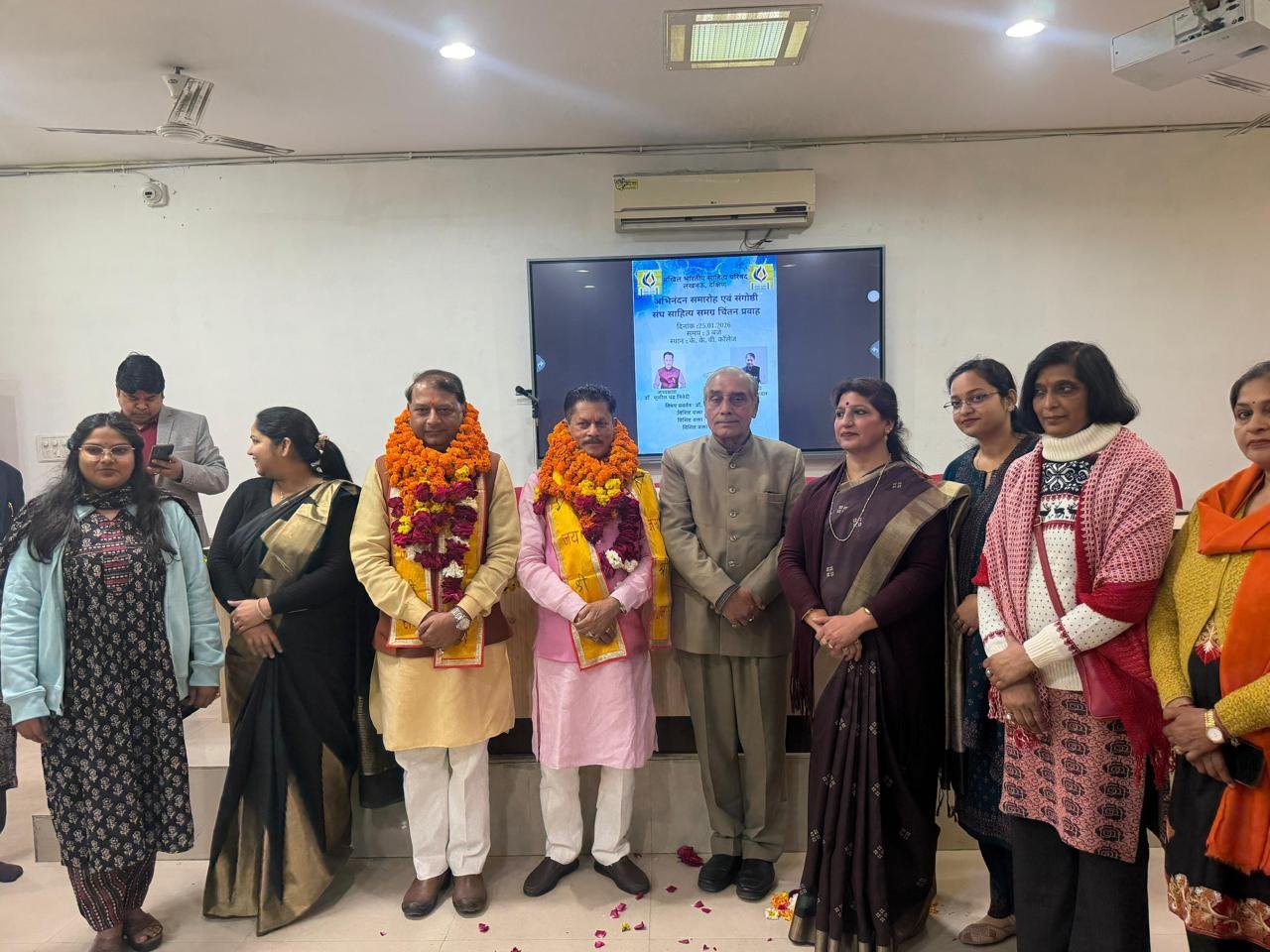 दिनांक 25.01.2026 को अभिनंदन समारोह एवं संगोष्ठी का आयोजन किया गया जिसका विषय था *संघ साहित्य समग्र चिंतन प्रवाह*। संगोष्ठी में दक्षिण इकाई की अध्यक्ष *प्रोफेसर डॉ नीतू शर्मा* द्वारा संचालन किया गया। प्रोफेसर शर्मा ने सभी अतिथियों का स्वागत किया एवं श्रीमती संगीता पाल द्वारा सरस्वती वंदना गान एवं दीप प्रज्वलन से कार्यक्रम की शुरुआत हुई इसके पश्चात् श्री राजीव वत्सल द्वारा परिषद गीत प्रस्तुत किया गया। इसके पश्चात् मंचस्थ विद्वजनों को पुष्पमाला, अंगवस्त्र एवं पौधा देकर अभिवादन किया गया।